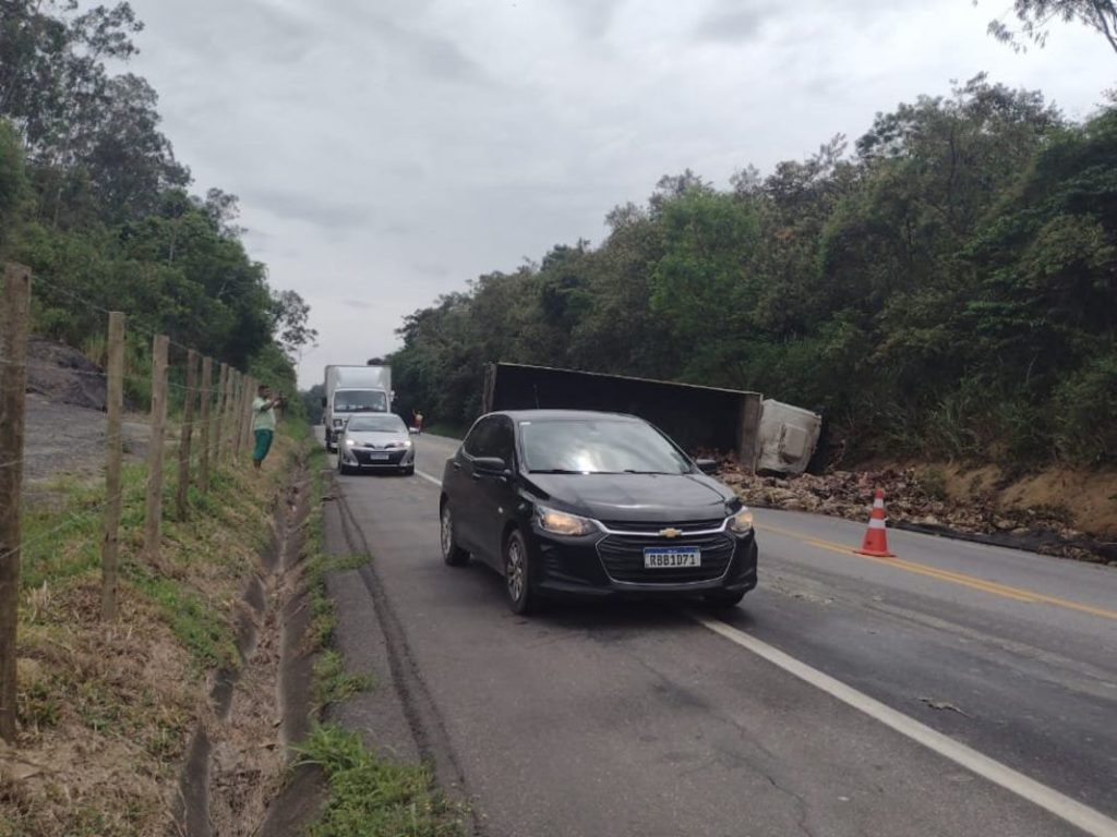 Perigo: caminhão tomba e interdita parcialmente BR-101 sul