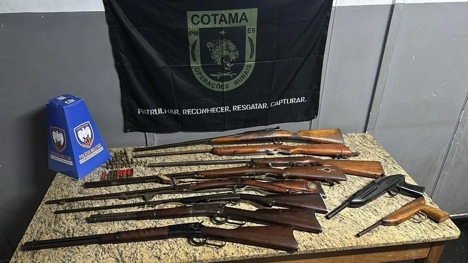 Nesta quarta-feira (27), a equipe do Comando de Operações Táticas em Mata Atlântica (COTAMA) deteve uma pessoa de posse de 10 armas de fogo, 44 munições de calibres diversos e animais da fauna brasileira que estavam sendo mantidos ilegalmente em cativeiro.