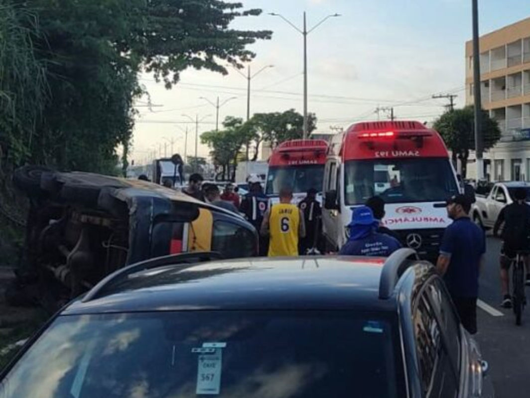 Descontrolada, van escolar despenca de barranco e capota em avenida