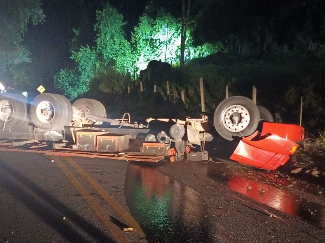 Após a violenta colisão, segundo a PM, a carroceria se desprendeu da cabine e se arrastou por alguns metros na pista e ali permaneceu transversalmente, interditando totalmente a rodovia.