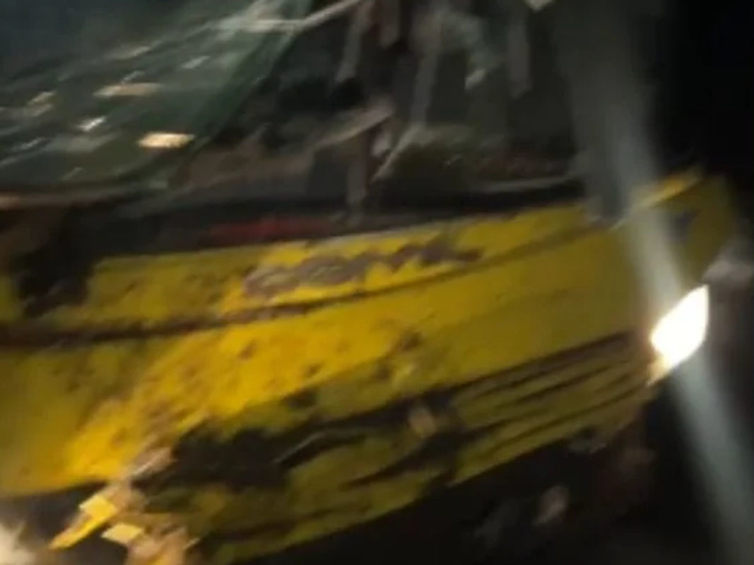 O ônibus estava estacionado e apresentava danos na parte dianteira.