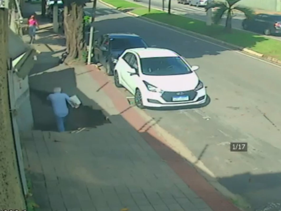 As cenas são impressionantes: o homem caminha calmamente sobre a calçada, quando uma enorme cratera repentinamente se abre embaixo dele e, literalmente, o engole.